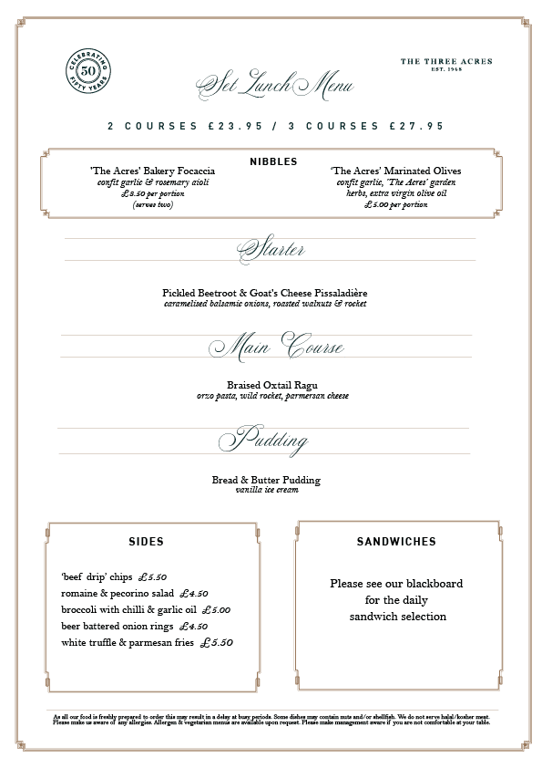 Set in the rolling, green Pennines, the Three Acres is a welcoming country inn and restaurant, which has been owned by the Truelove family for over 50 years.